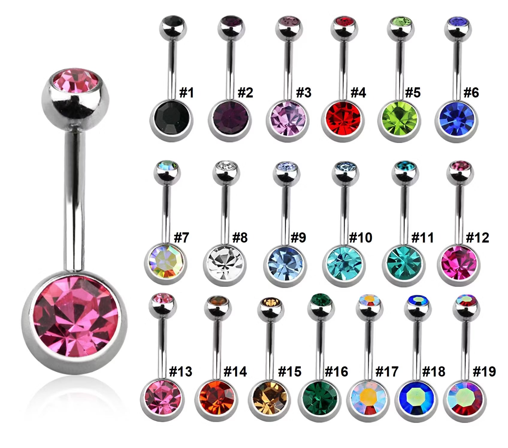 Elegant navelsmycke i 316L kirurgiskt stål, med 5 mm och 8 mm kulor prydda med gnistrande crystal.