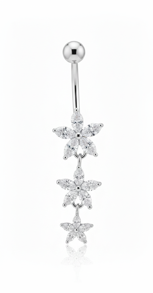 Navelpiercing med tre hängande blommor i kirurgiskt stål.