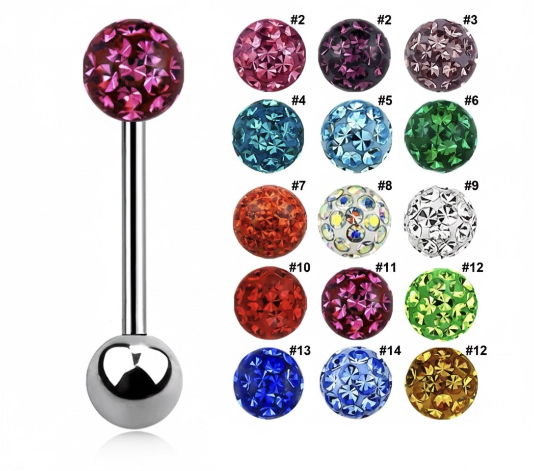 Tungpiercing i 316L kirurgiskt stål med två 6 mm kulor, varav en dekorerad med gnistrande kristaller för extra glans.