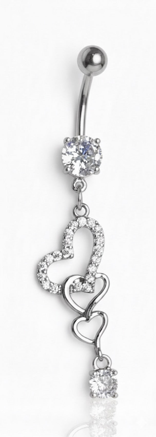 Navelpiercing i silver av kirurgiskt stål med små hängande hjärtan.